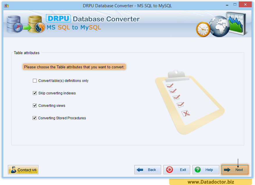 Select table attributes like views, indexes, stored procedures etc. that you want to convert and proceed to next step.